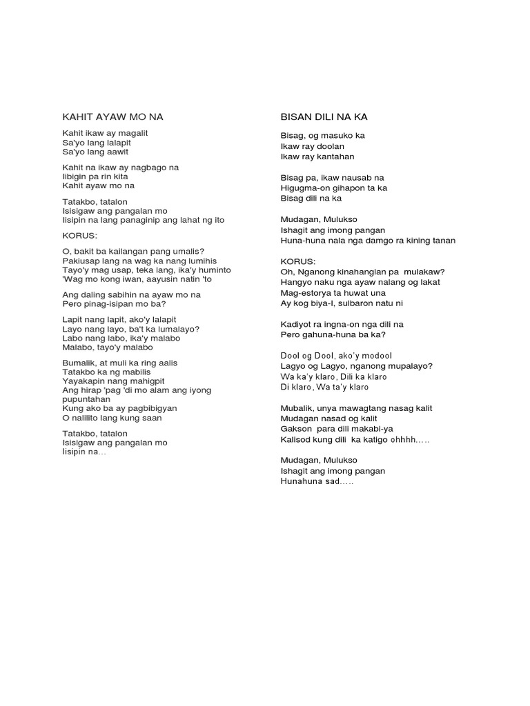 Kahit ayaw mo na lyrics printable. Please if u can DONT MIND my angle. Lyrics to Kahit Ayaw Mo Na. Kahit ikaw ay magalit Sayo lang lalapit Sayo lang aawit Kahit na ikaw ay nagbago na Iibigin pa rin kita Kahit ayaw mo na Tatakbo tatalon Isisigaw ang pangalan mo Iisipin na lang panaginip ang lahat ng ito O bakit ba kailangan pang umalis.